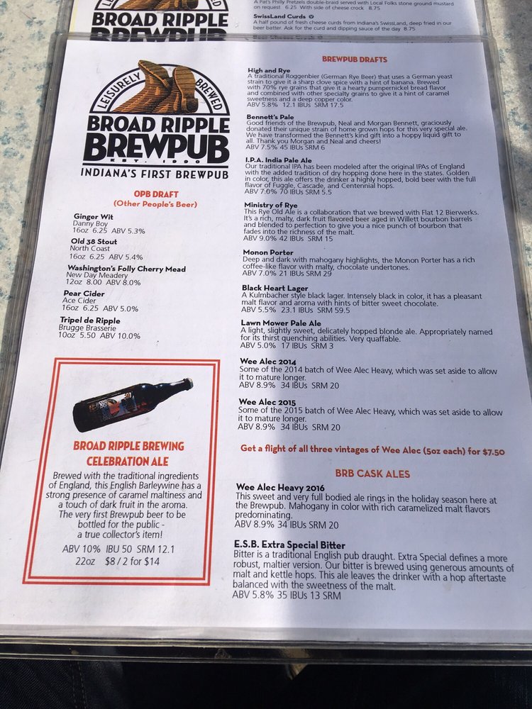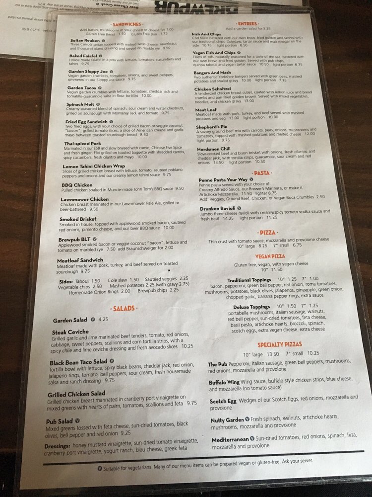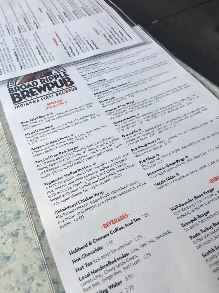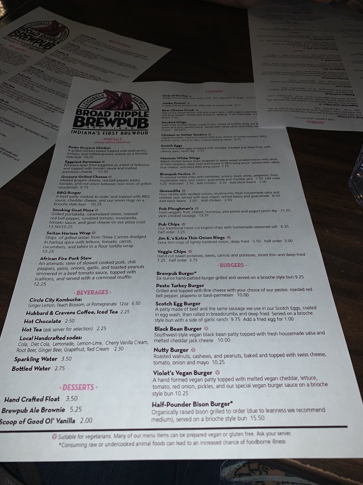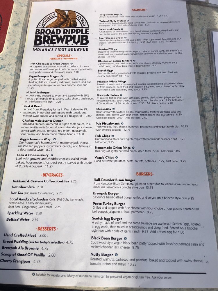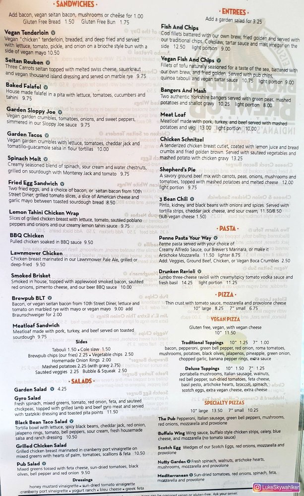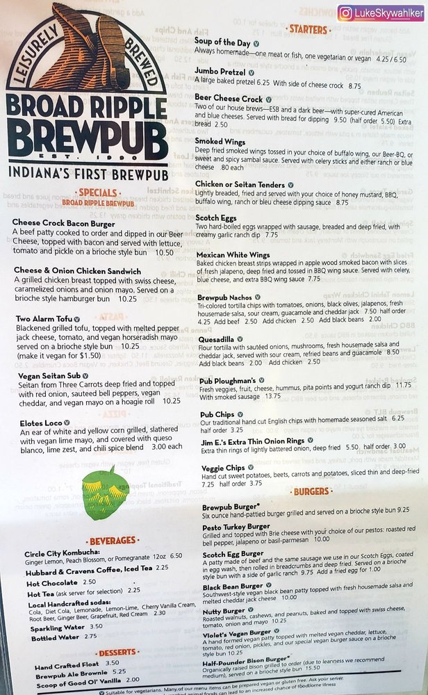 Introducing the menu at Broad Ripple Brewpub: Located in Indianapolis, Broad Ripple Brewpub is a vegetarian brewpub offering a wide range of dishes to satisfy all palates. From starters like Jim E's Extra Thin Onion Rings and Seitan Tenders to hearty soups of the day and flavorful salads like the Pub Salad and Black Bean Taco Salad, there is something for everyone here. The menu also features a variety of options for main courses, ensuring a satisfying dining experience for vegetarians and vegans alike. With options for delivery, takeout, and even catering, Broad Ripple Brewpub is a versatile and welcoming spot for a casual or classy dining experience. Don't miss out on the Happy Hour specials and the covered outdoor seating for a pleasant dining experience.